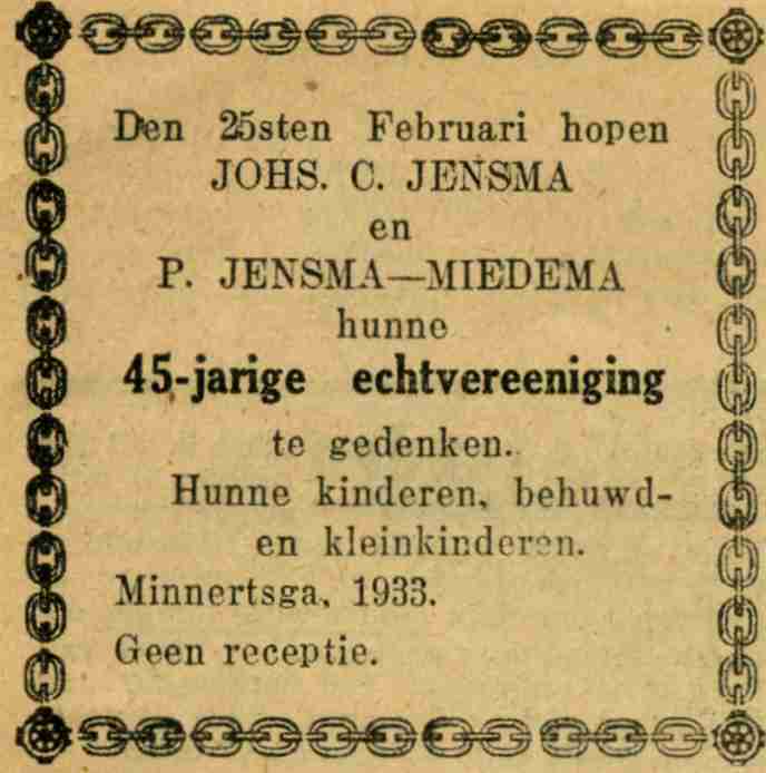 Johannes Kornelis Jensma is geboren op 25-05-1858 in Minnertsga. Johannes is overleden op 10-08-1947 in Minnertsga, 89 jaar oud. Hij trouwde, 29 jaar oud, op 25-02-1888 in Barradeel met Pietje Miedema, 19 jaar oud. Pietje is geboren op 01-01-1869 in Stiens. Pietje is overleden op 06-05-1934 in Minnertsga, 65 jaar oud.