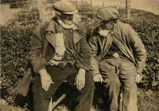 De fotograaf treft twee mannen aan op een bankje ergens in het dorp. De mannen hebben – zo te zien – al een aantal levensjaren achter de rug. Lopen ze tegen de tachtig? Het lijkt er wel op, hoewel . . . vroeger leken de mensen op jongere leeftijd veel ouder dan tegenwoordig. Ondanks dat het volop zomer is, zitten de mannen flink in de kleren. Een manchester broek aan, de linker persoon zelfs nog in een dikke winterjas zo lijkt het wel.