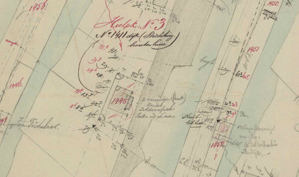 De locaties op de kaart zijn gemaakt door een oude kadastrale kaart (1887) over GoogleMaps te leggen en vervolgens de coördinaten over te nemen en op onderstaande OpenStreetMap te plaatsen. Er kan enige afwijking zijn ten opzichte van de vroegere exacte locatie. De blauwe pinnen op de kaart zijn woningen die eind jaren zestig zijn gesloopt. De gele pinnen geven aan welke woningen in 1931 of eerder zijn gesloopt.